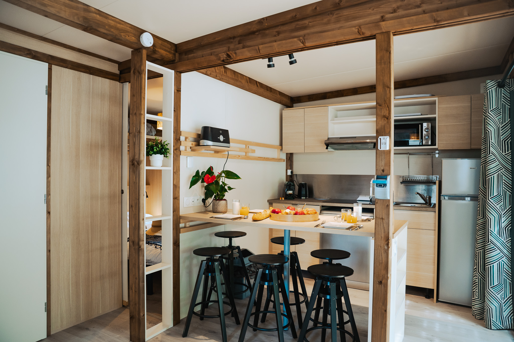 Equipped kitchen with dishes, microwave, ceramic hob, fridge with toaster freezer, kettle, espresso capsule coffee machine. Washing machine and dishwasher.