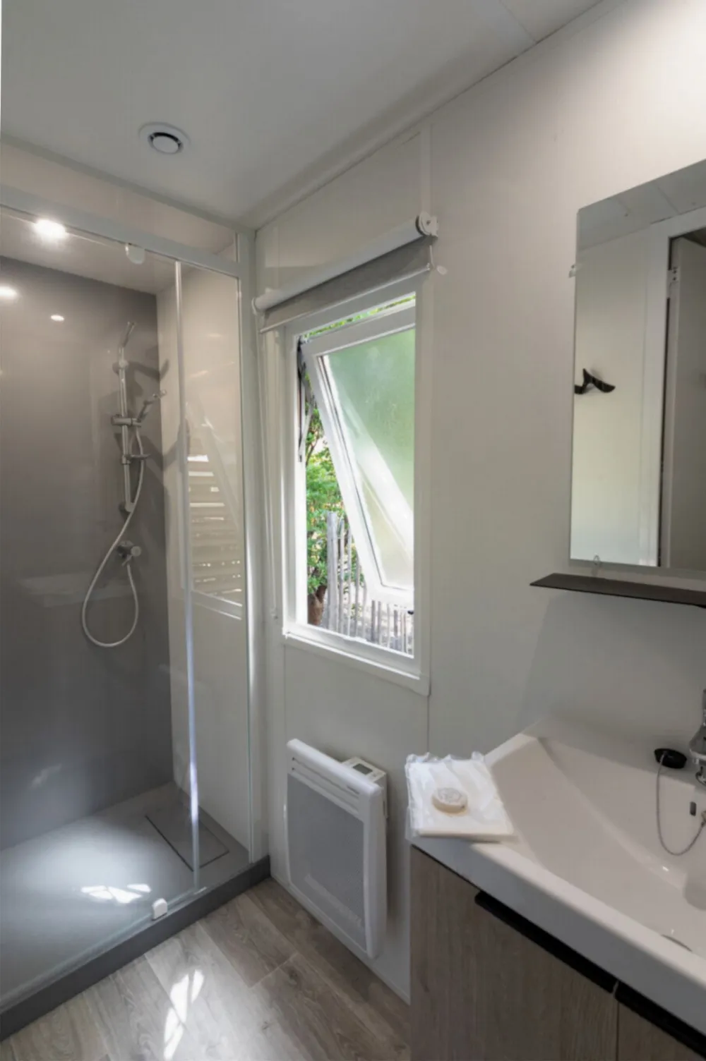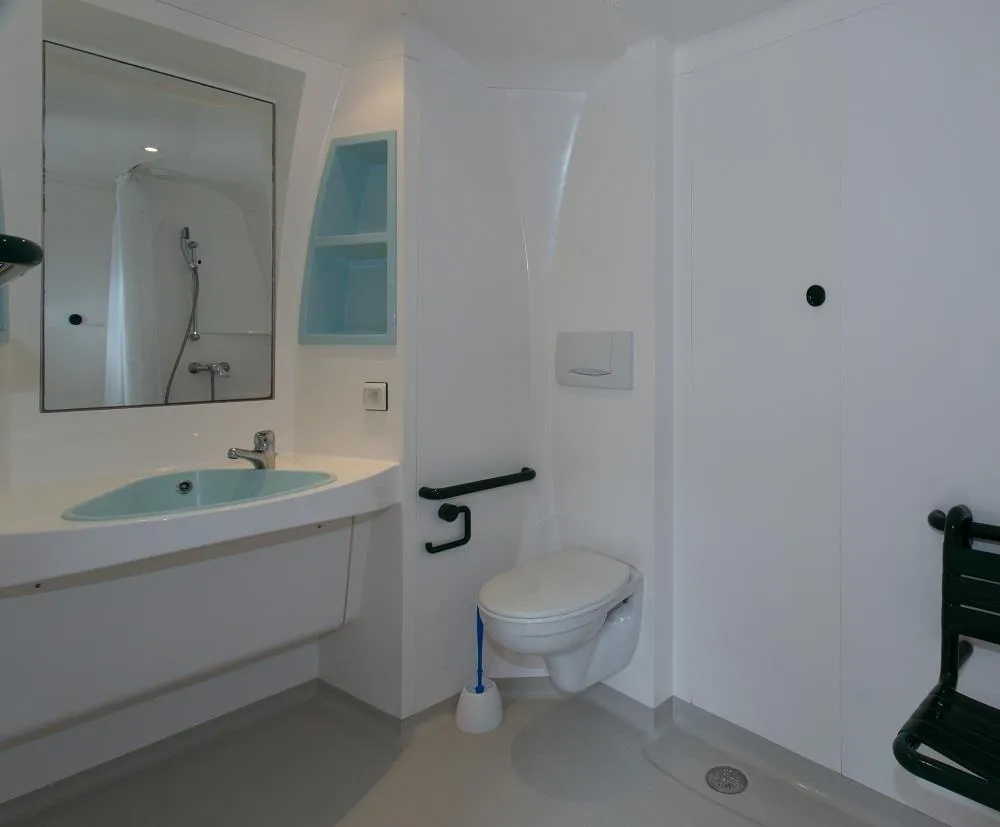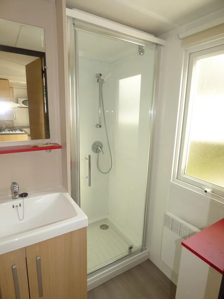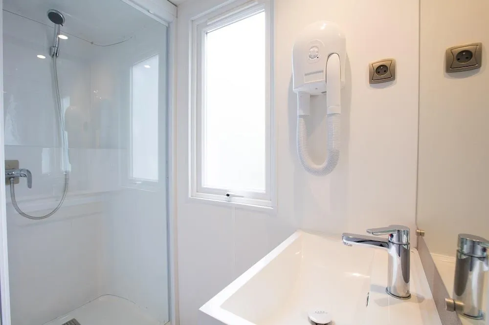 1 bed 160 x 200 + roller shutters + bathroom with XL shower cabin with suspended toilet + towel dryer + hair dryer