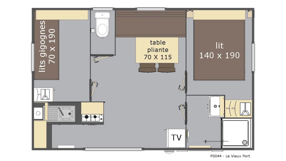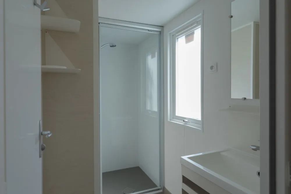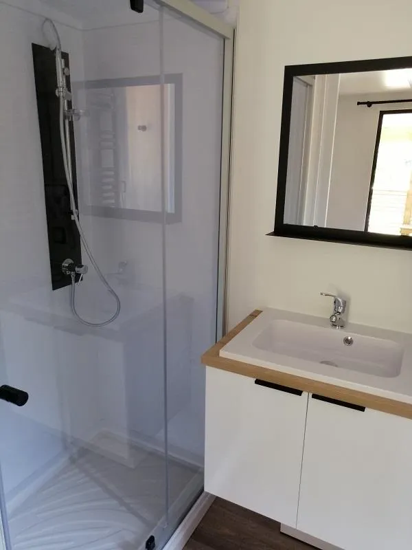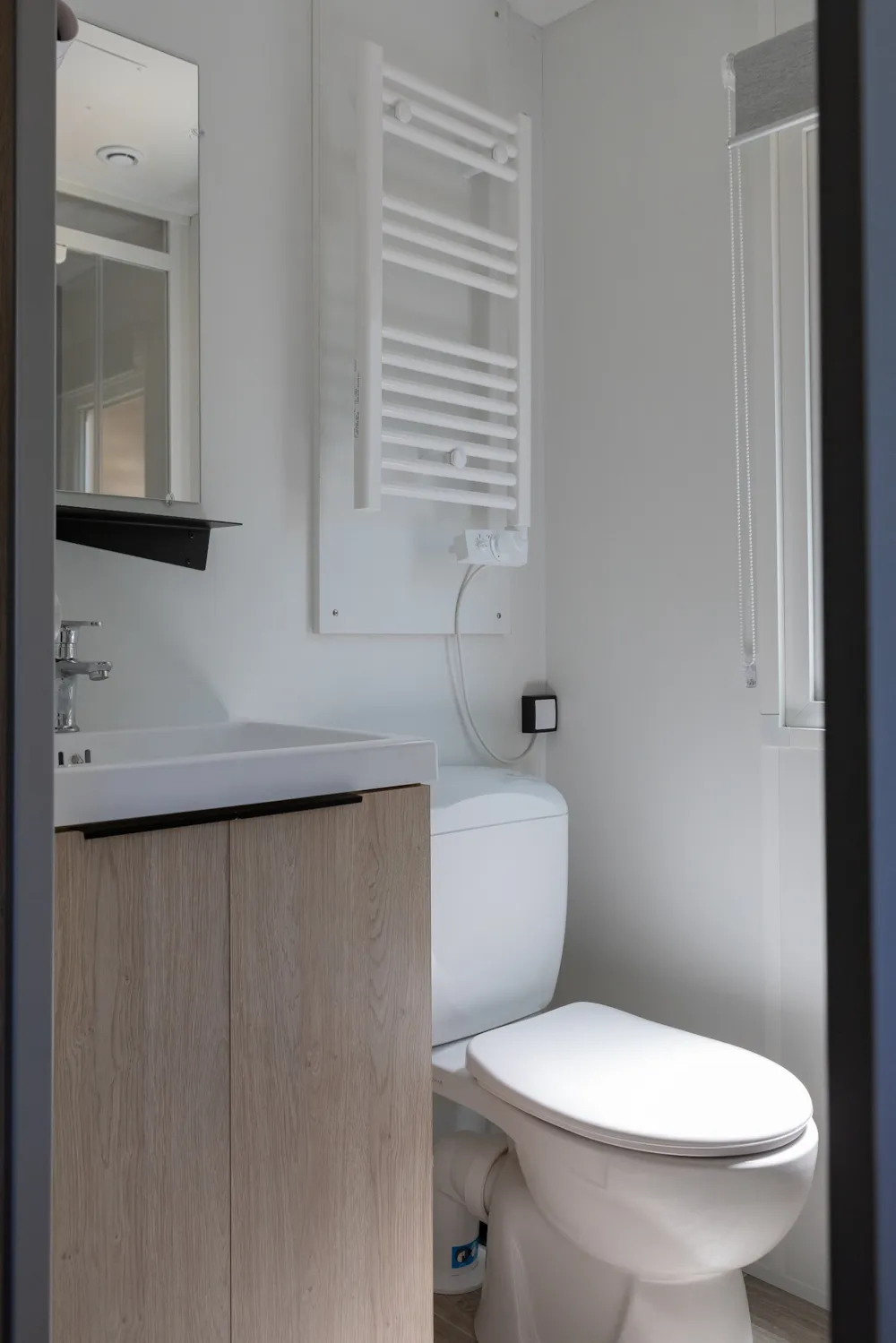 1 bed 160 x 200 + roller shutters + bathroom with XL shower cabin with suspended toilet + towel dryer + hair dryer