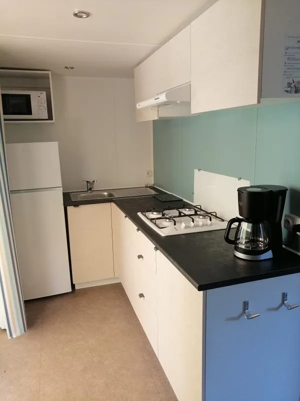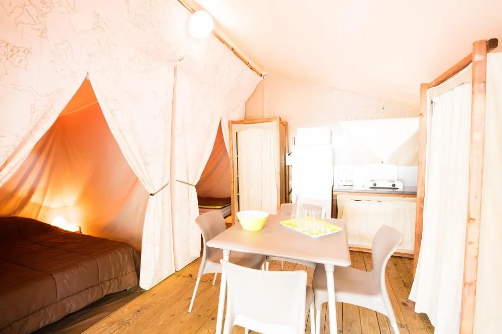LODGE LAGOON is a Tent Bungalow with electricity WITHOUT sanitary facilities composed of 2 bedrooms - with kitchen equipped with microwave, coffee maker, top refrigerator, 2 hotplates, living room. Vehicle parked on site